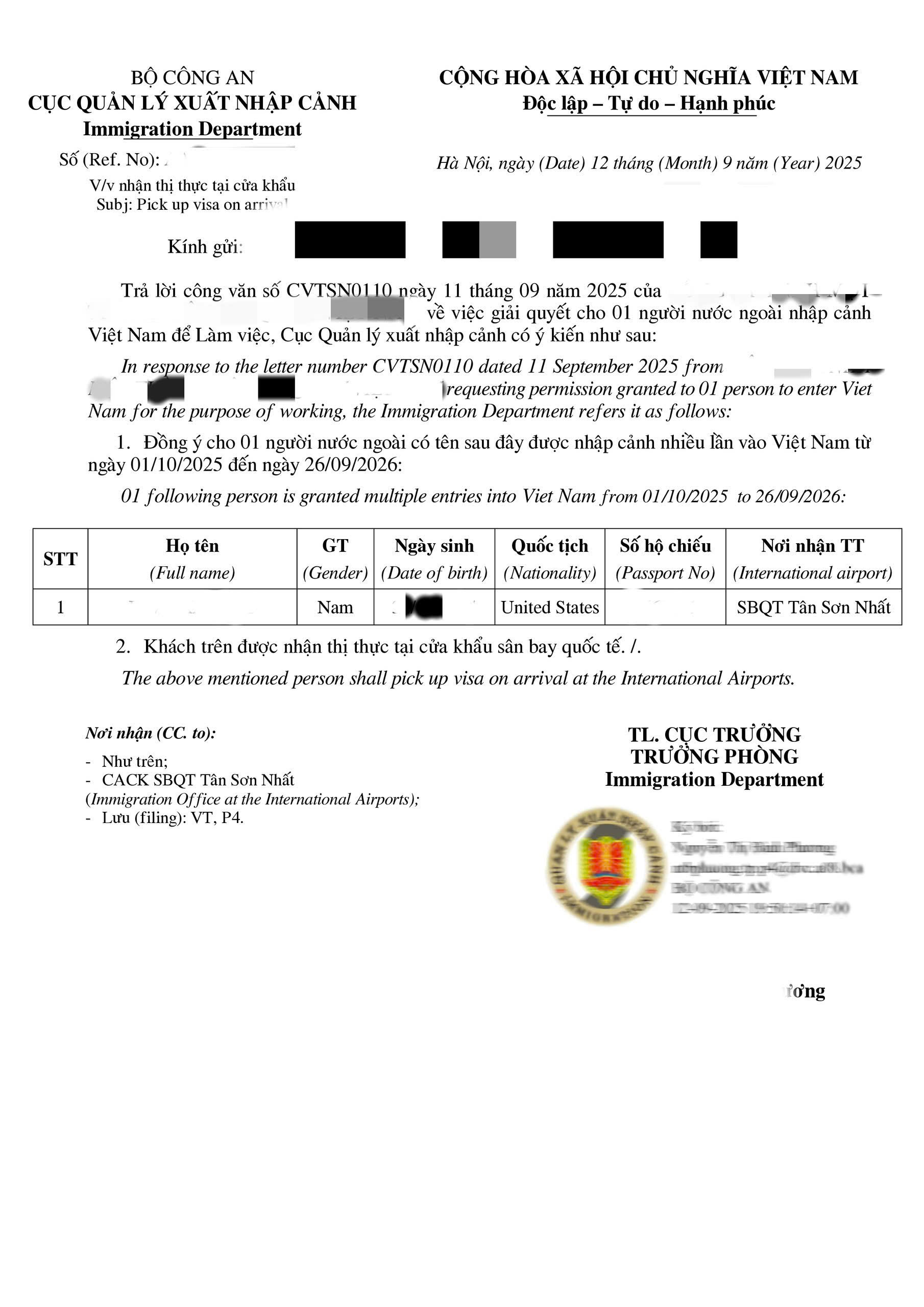 In particular, because the process of applying for an entry permit is currently being done online, the entry permit will have an electronic stamp, not a red stamp as before.